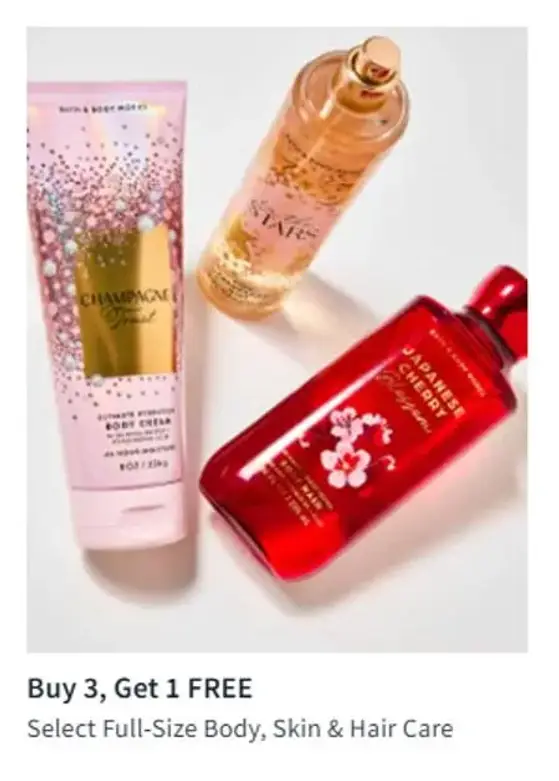 Don't miss out! Shop in store and enjoy buy 3, get 1 free select full-size body, skin, & hair care.